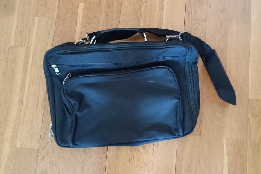 Svart datorväska med flera fack och dragkedjor. Väskan har ett handtag och en justerbar axelrem.