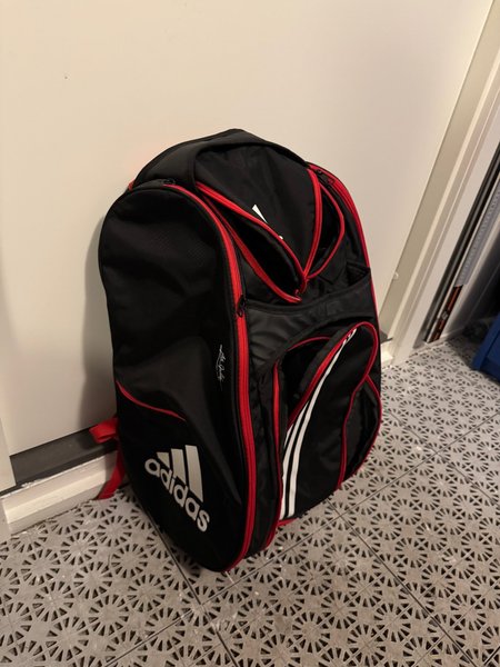 Svart Adidas padelväska med röda detaljer och plats för mycket.