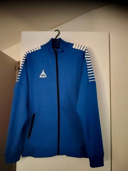 Blå träningsjacka från Select med dragkedja framtill och vita ränder på ärmarna. Jackan har även två fickor med dragkedja.