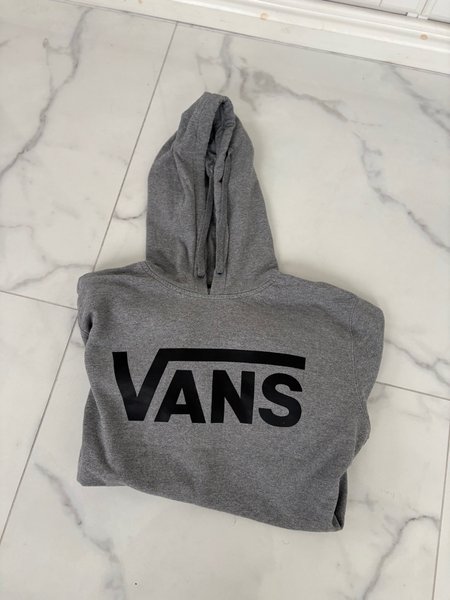 Grå huvtröja med långa ärmar och en stor svart VANS-logotyp tryckt på framsidan. Tröjan har en luva