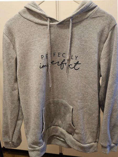 Grå huvtröja med texten "PERFECTLY imperfect" tryckt i svart på framsidan. Tröjan har en känguruficka framtill och dragsko i luvan.