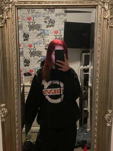 Svart huvtröja med ett stort tryck på framsidan. Trycket är cirkulärt med text och en grafisk design i vitt och rött. Tröjan har långa ärmar och en luva.