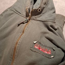 Röd huvtröja med texten "Bloomington" i blått och vitt broderad på framsidan. Under texten finns ett runt emblem med texten "Montpellier" och "Since 1602". Tröjan har en känguruficka framtill och en vit dragsko i luvan. Insidan av luvan är vit.