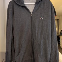 En grå huvtröja med en mjuk, vit fleecefodring (inte fodring i armarna). Tröjan har en dragkedja framtill och en huva. Den är i gott skick.