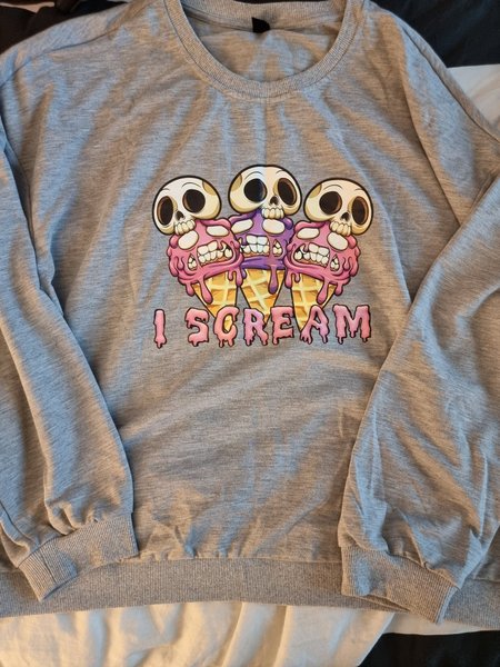 Grå sweatshirt med rund halsringning och långa ärmar. Tröjan har ett tryck framtill med tre döskallar som glasskulor i våfflor, med texten "I SCREAM" under. Muddar finns vid ärmslut och nederkant.
