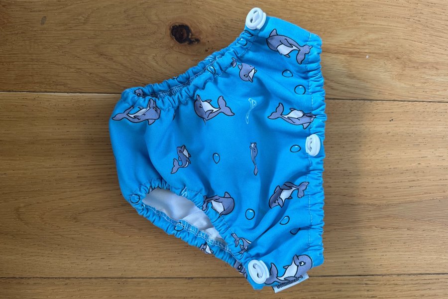 Blå badblöja med mönster av delfiner och bubblor. Blöjan har dragsko i midja och benöppningar.