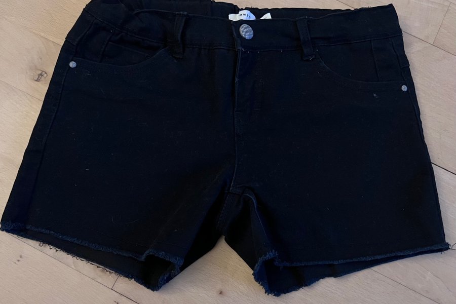 Sorte shorts med rå kant forneden og en knaplukning.