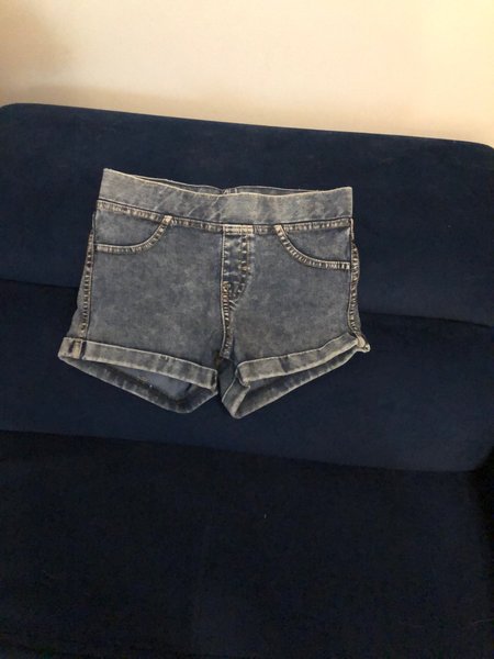 Ett par blå denimshorts med resår i midjan och fickor fram.