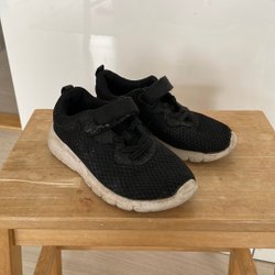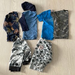 Parti med fyra par shorts för barn. Ett par är mörkblå med vit dragsko i midjan. Ett par är ljusblå med resår och knapp i midjan. Ett par är gråmelerade med knapp och dragkedja samt fickor fram och bak. Ett par är mörkblå med resår och dragsko i midjan.