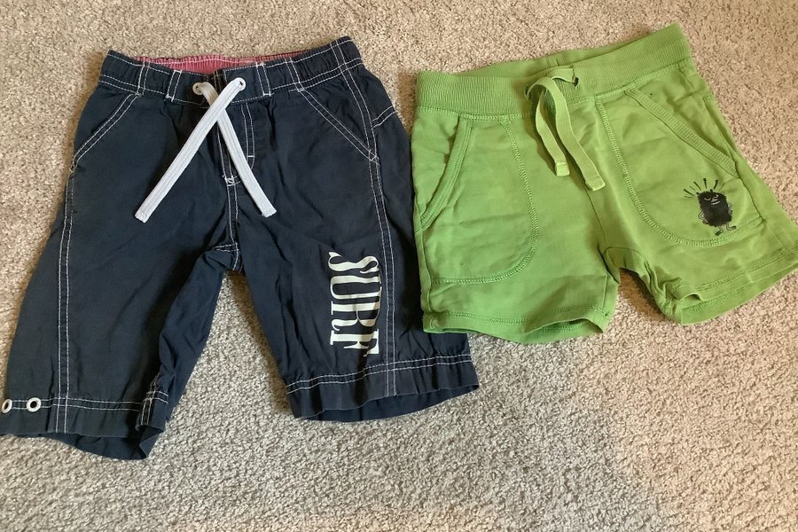 Ett par mörkblå shorts med vita sömmar och texten ”SURF” längs ena benet. Shortsen har en resårlinning med vit dragsko och två fickor framtill. Ett par ljusgröna Mumin-shorts med resårlinning och dragsko. Shortsen har två fickor framtill och ett svart mumintryck på ena benet.