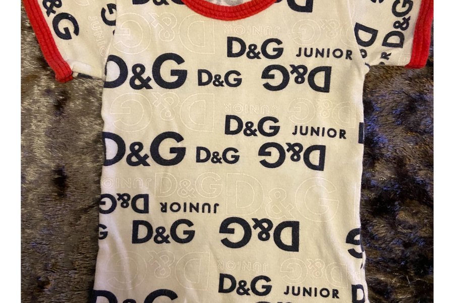 Vit t-shirt med röd kant och D&G Junior tryck.