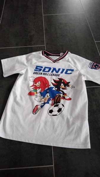 Vit t-shirt med tryck av Sonic, Knuckles och Shadow från Sonic Green Hill League. T-shirten har en sportig design med en rund halsringning i marinblått, vitt och rött.