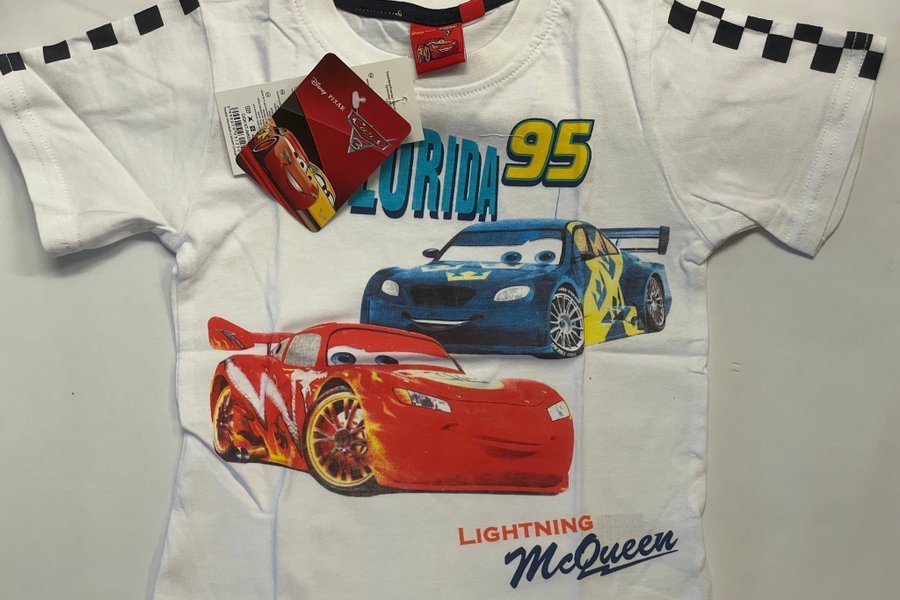 T-shirt med motiv från Disney Pixar filmen Bilar. Tryck med Blixten McQueen och Florida 95. Svart schackrutigt mönster på ärmarna.
