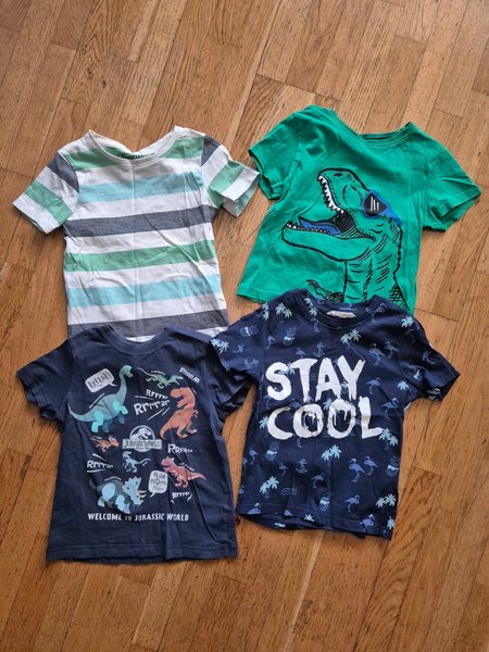 Fyra kortärmade t-shirts för barn. En vitrandig t-shirt med blå och gröna ränder (storlek 104). En grön t-shirt med ett stort dinosauriemotiv med solglasögon (storlek 98). En mörkblå t-shirt med olika dinosaurier och texten "WELCOME TO JURASSIC WORLD" (storlek 98/104). En mörkblå t-shirt med texten "STAY COOL" och mönster av palmer, ananaser och flamingos (storlek 98/104).