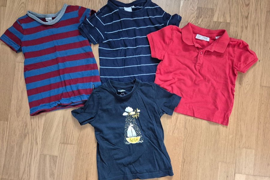 Ett set med fyra t-shirts för barn. Inkluderar en röd pikétröja, en marinblå randig tröja, en mörkblå tröja med tryck och en randig tröja i rött och blått.