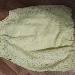 Gul overdel med korte ærmer og en sort og hvid stribet kant ved halsen. Overdelen har en løs pasform og et let, luftigt udseende.