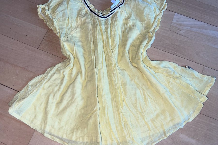 Gul overdel med korte ærmer og en sort og hvid stribet kant ved halsen. Overdelen har en løs pasform og et let, luftigt udseende.