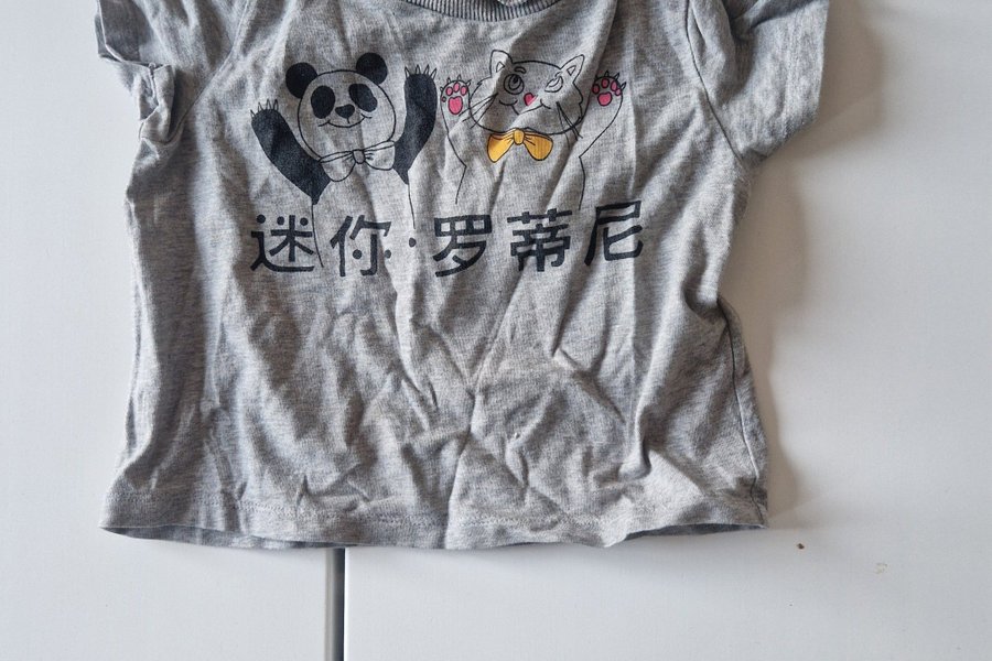 Grå t-shirt med tryck av en panda och en katt med text på kinesiska. Tröjan har korta ärmar och en rund halsringning.