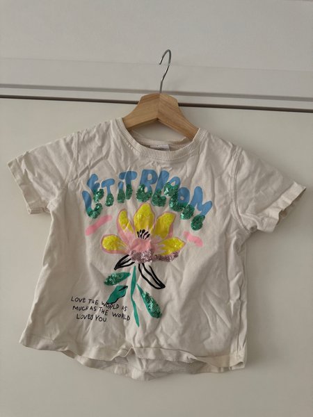 Vit t-shirt med kort ärm och rund halsringning. Tröjan har ett stort tryck på framsidan med texten "LET IT BLOOM" i blått och gröna paljetter, samt en stor blomma i gult, rosa och gröna paljetter. Nedtill på framsidan står texten "LOVE THE WORLD AS MUCH AS THE WORLD LOVES YOU."