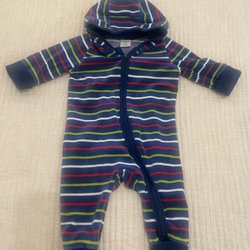 Blå sweatshirtoverall med luva och dragkedja framtill. Overallen har två fickor fram och ett randigt foder i luvan. Mycket fint skick! Djur och rökfritt hem.