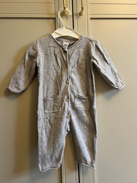 Grå stickad jumpsuit med långa ärmar och ben. Den har knappar framtill och två små fickor på framsidan.
