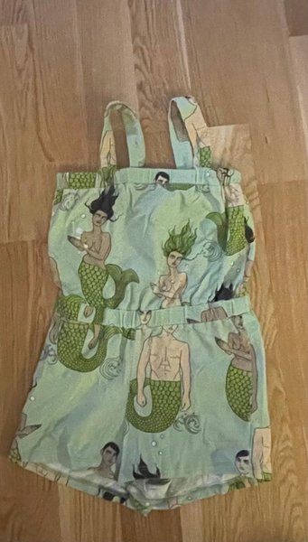 Färgglad sommarjumpsuit med ett unikt tryck av sjöjungfrur och sjömän. Jumpsuiten har breda axelband och resår i midjan.