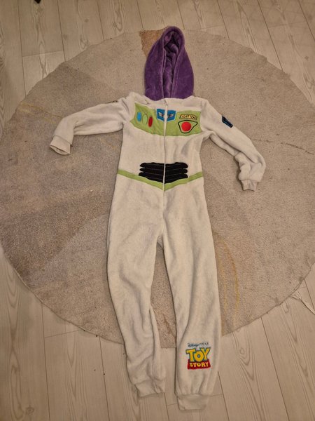 Vit onesie med Buzz Lightyear tema och lila huva. Dräkten har detaljer som liknar Buzz Lightyears rymddräkt, inklusive tryck och applikationer. Vid foten finns en Toy Story logga.