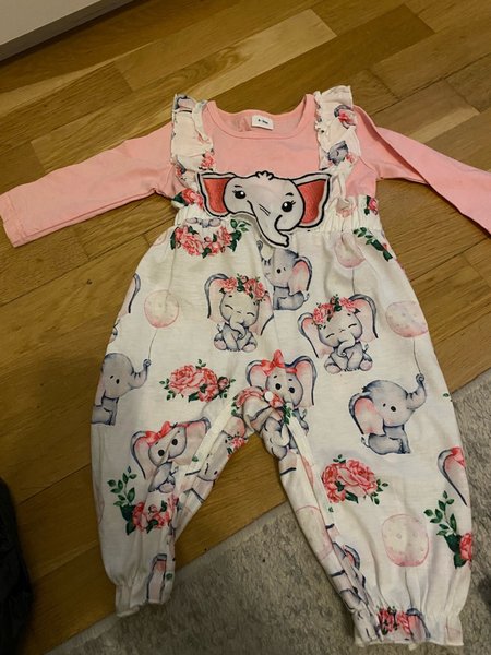 Söt jumpsuit med långa ärmar och ett elefantmönster. Overallen har en ljusrosa överdel och en vit underdel med elefanter och blommor.