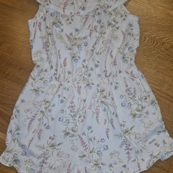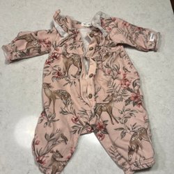 Söt sparkdräkt med långa ärmar och ett blommigt mönster. Den har volanger framtill.