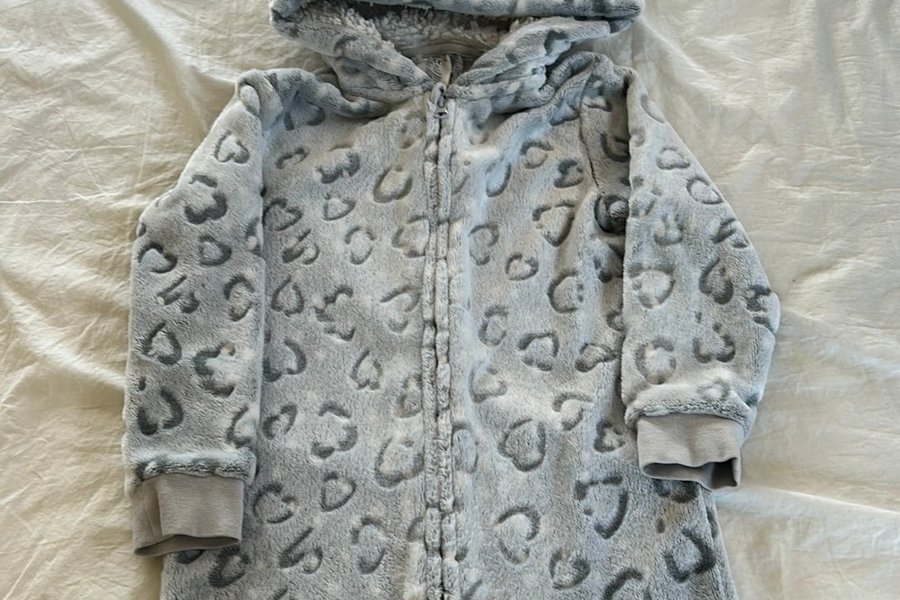 Mysig snöleopard- onesie med luva och dragkedja. Storlek 122.