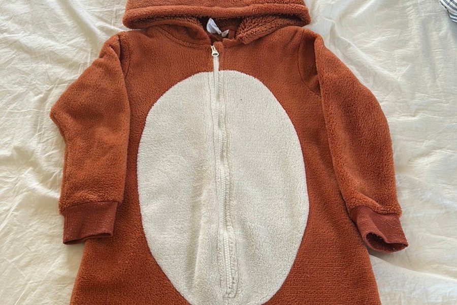 Räv-fleecedräkt med luva och dragkedja framtill.
