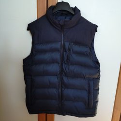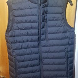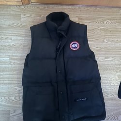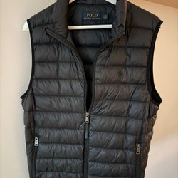 Svart vadderad väst med huva. Västen har en dragkedja fram och två fickor.