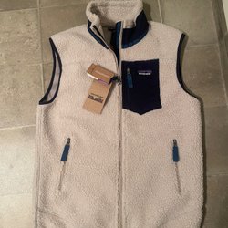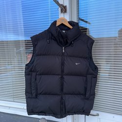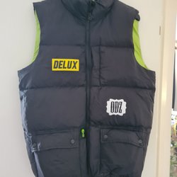 Vit och svart väst från Meters/bonwe med UMA logga. Väst har dragkedja och knappar framtill samt dragsko nedtill. skick: finns några knapp synliga fläckar på framsidan, behöver tvättas; annars är i mycket fint skick, 100% polyester, tjock väst; längd 67cm, bröstvidd 61cmx2