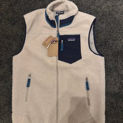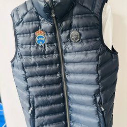Vit och svart väst från Meters/bonwe med UMA logga. Väst har dragkedja och knappar framtill samt dragsko nedtill. skick: finns några knapp synliga fläckar på framsidan, behöver tvättas; annars är i mycket fint skick, 100% polyester, tjock väst; längd 67cm, bröstvidd 61cmx2