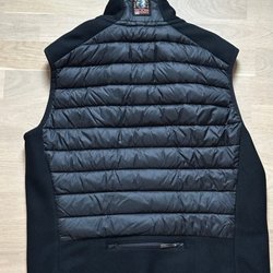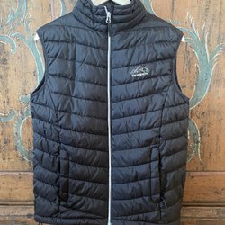 Svart väst med dragkedja framtill. Västen har två fickor fram och är fodrad med ett ljust, luddigt material. Baksidan är slät.