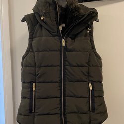 Svart äkta kanin päls väst med dragkedja, huva och fickor. Västen har ribbstickade detaljer.