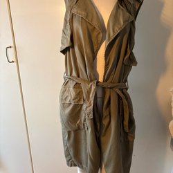 En väldigt fin grön väst med detaljer som fickor, dragkedja och knappar. Fodrad med ett blommigt tyg och har en stor krage i fuskpäls. Snörning baktill.