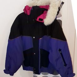 Ny och oanvänd vinterväst med avtagbar huva från Esmara, magenta/lila/mörkt rosa utsida med svart insida. Stängning med dragkedja och knappar. Två fickor. Storlek 42.
