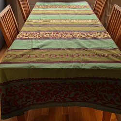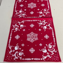 Röda lappar i olika mönster sydda på blått fodertyg. Små slitsar i sidsömmarna, kantad med rött band, knäpps med fem knappar.