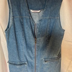 Blå väst med hög krage och dragkedja framtill. Västen har två fickor fram.