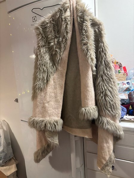 En beige väst med detaljer av fuskpäls. Västen har fuskpäls vid kragen och ärmslut.