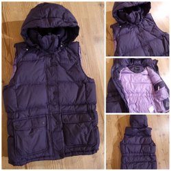 Vändbar dunväst med dragkedja framtill och hög krage. Den ena sidan är svart och den andra har ett mönster i grå och svarta toner. Västen har fickor med dragkedja på den svarta sidan.