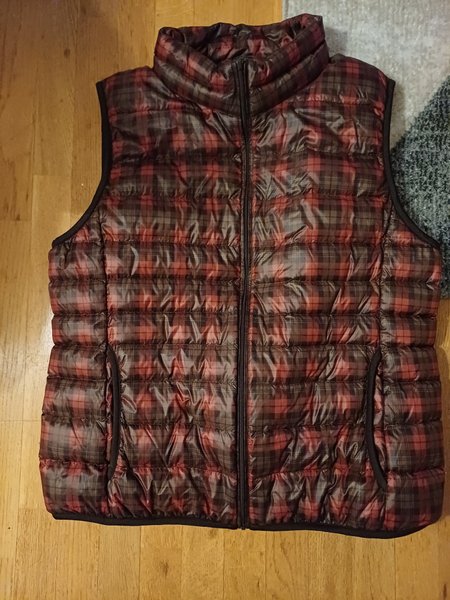 Vadderad väst med dragkedja framtill och hög krage. Västen har ett rutigt mönster i rött och brunt.