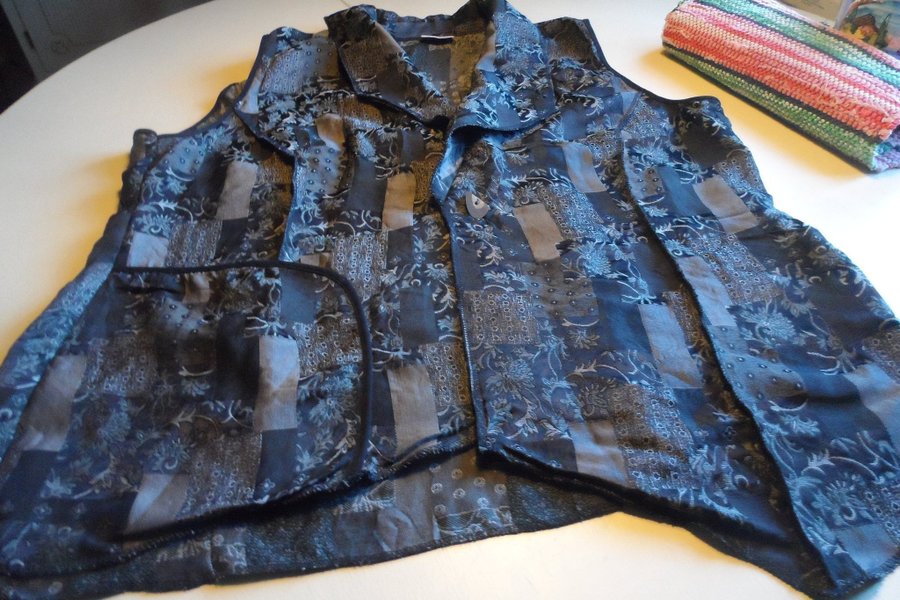 Väst med krage och knäppning framtill. fickor. svart ljusgrå i färgen stl 50, mycket snygg. dansk design. polyester viscose.