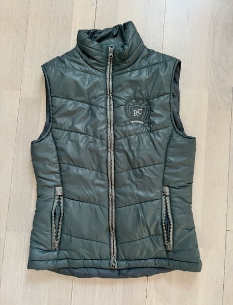 Grön vadderad väst med dragkedja fram och fickor med dragkedja. Västen har krage.