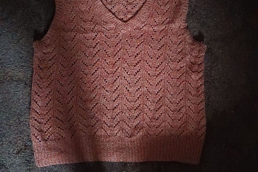 Stickad väst med V-ringning och ett detaljerat vågmönster. Västen har ribbstickade kanter vid hals, ärmhål och nederkant.