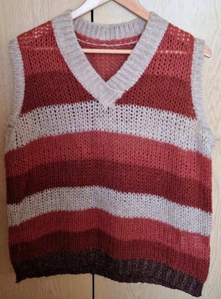 Stickad väst med V-ringning och ett randigt mönster i olika nyanser. Västen har en avslappnad passform och är ärmlös.