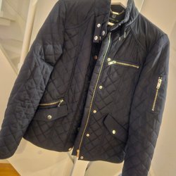 Lång, beige, quiltad väst med dragkedja framtill och två fickor. Västen har ett mönstrat foder.