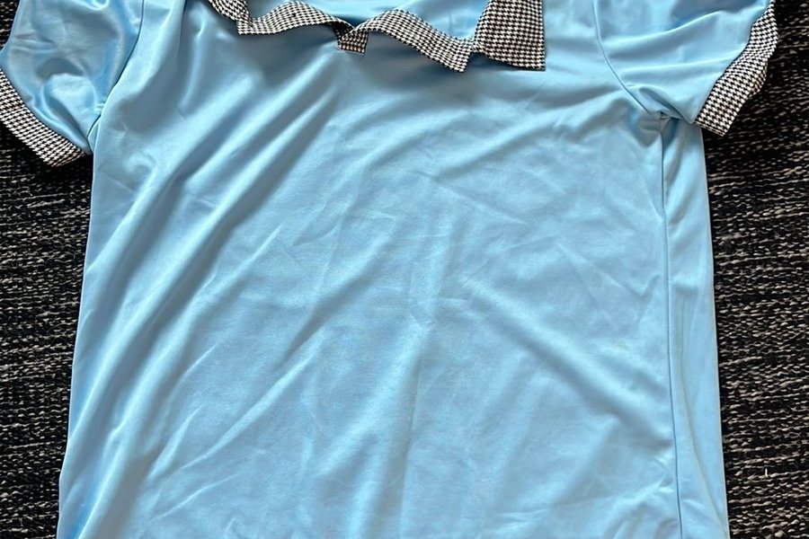 Ljusblå kortärmad tröja med krage och ärmslut i ett svartvitt hundtandsmönster.