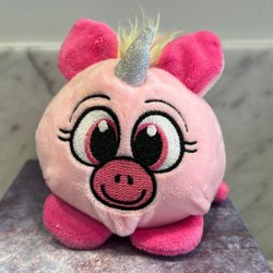 Sött mjukdjur i form av en rosa enhörning med glitterdetaljer. Perfekt som gosedjur eller dekoration.